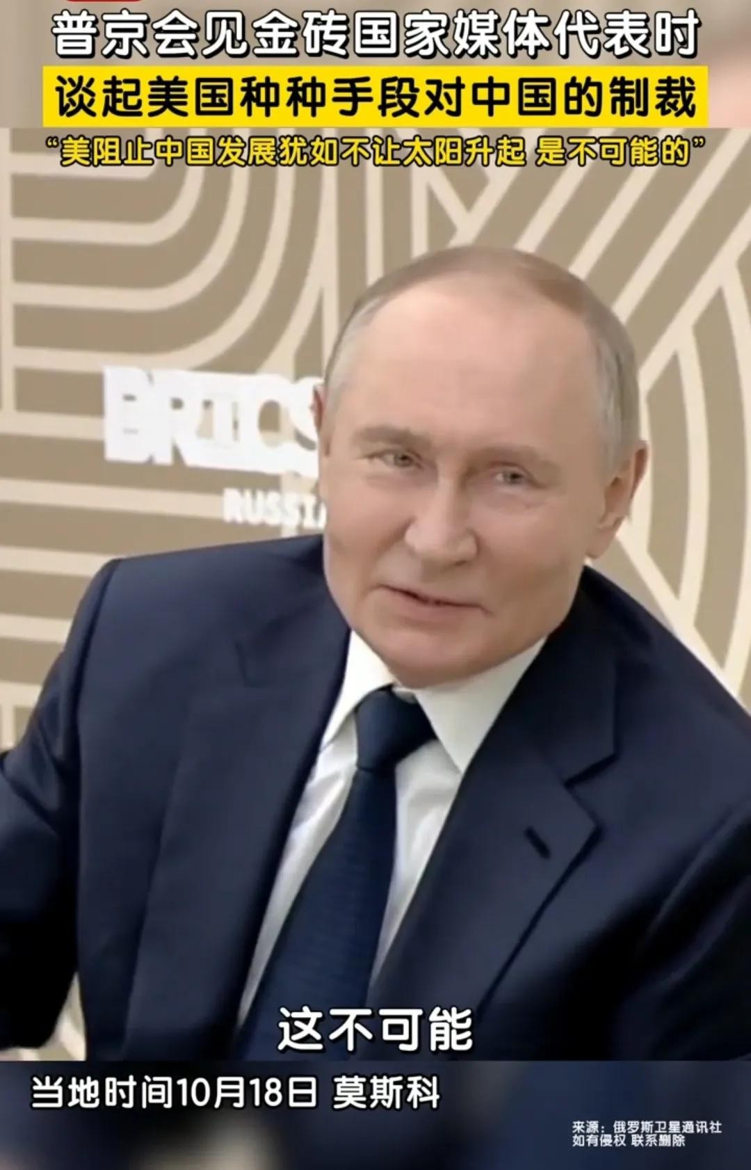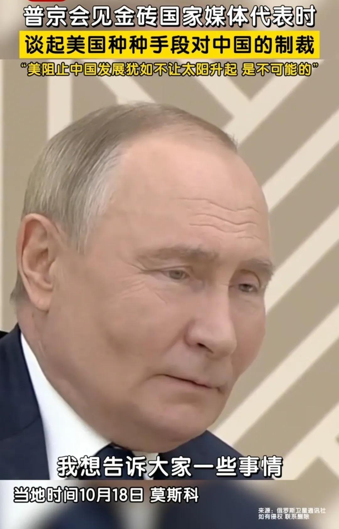 10月18日,俄罗斯总统普京会见金砖国家媒体代表时说到:“美国妄图阻止中国发展,就像让太阳不要升起一样,那是不可能的!”