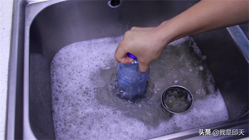 接下来,我们先在洗碗池里蓄上多点的水,然后再把塑料瓶剪开的一端对准下水道口,再来回不停地抽动几下。瓶子在来回抽动的过程中,就会增加下水道里的压强,这样下水道里面的异物在压强的作用下就会被冲掉,那下水道就会被疏通,我们就可以正常的使用了。