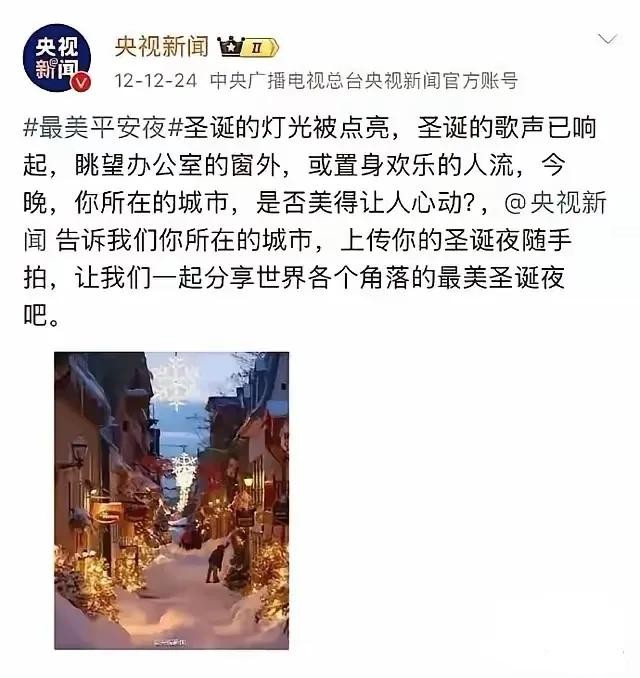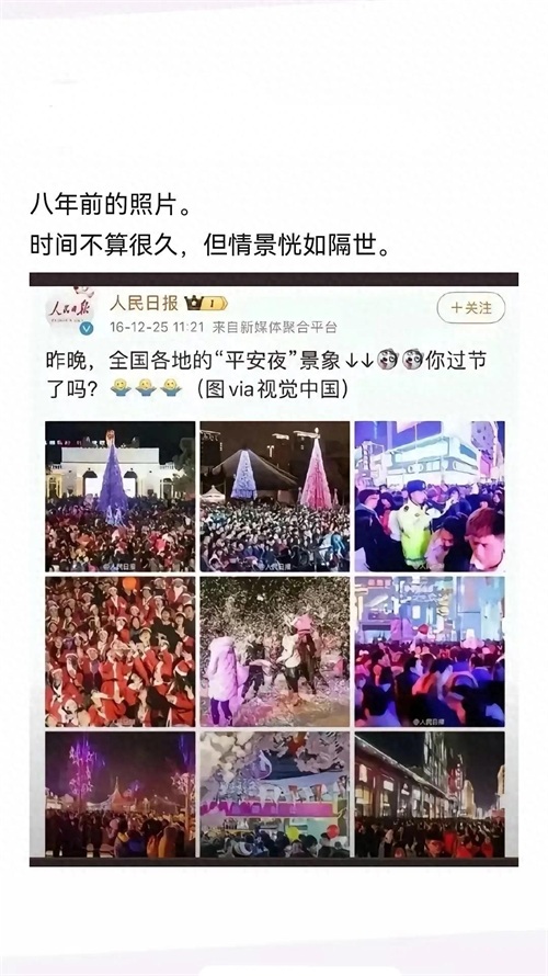 下面两图是人民日报客户端2016年平安夜的新闻报道和央视新闻前天的新闻报道,时隔八年,平安夜、圣诞节光怪陆离的光环褪去,已经从万人空巷沦落到空巷无人的境地。