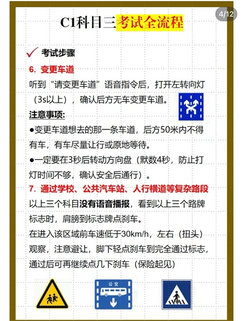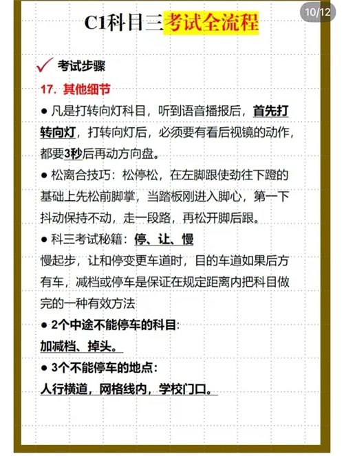 另外,打转向灯后要看后视镜,松离合有技巧,牢记“停、让、慢”秘籍。还有一些中途不能停车的科目和地点,都要格外注意!祝大家都能顺利通过科目三考试!