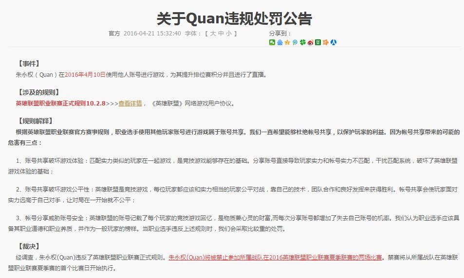 经调查,朱永权(Quan)违反了英雄联盟职业联赛正式规则。朱永权(Quan)将被禁止参加所属战队在2016英雄联盟职业联赛夏季联赛的两场比赛。禁赛将从所属战队在英雄联盟职业联赛夏季赛的首个比赛日开始执行。