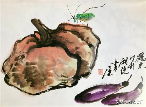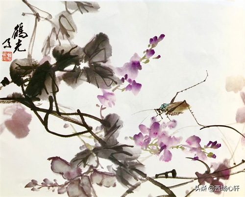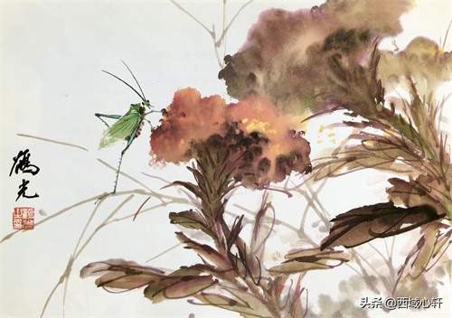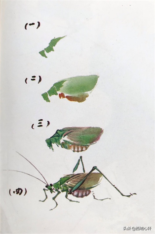 落笔先画头、背,后用嫩绿略渗一点三绿点厾二翅,前翅全见,后翅见部分,翅后呈三角状。再用绿色蘸一点曙红画肚,并勾出肚子的凹凸,在凸出部分点上白粉,以表现肚的立体感,稍干后再用浓淡适度的墨色勾各部位分界处。在足的部位上、点一点石绿,以提精神,尤其是后面二只大足。最后点眼睛、勾须。