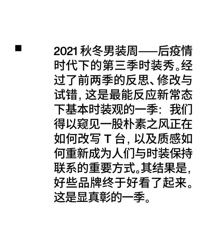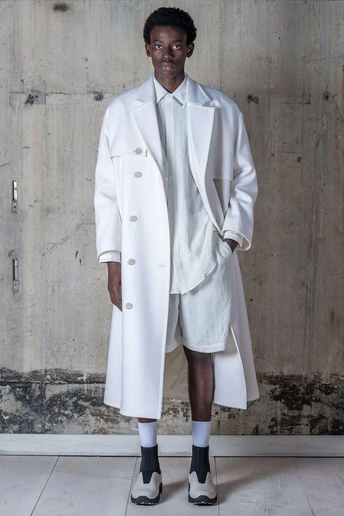 全球新一轮封锁让A-COLD-WALL* 21秋冬男装系列以短片形式率先发布,一系列 "充满希望、积极向上 “的亮白色造型拉开了大秀的序幕,之后,从带有大胆工业元素的光滑剪裁、作为与Mackintosh新合作的一部分而设计的混搭外套,到印有ACW标志的代表性风衣、有冲击力的针织毛衣背心,以及带有建筑图案的T恤、衬衫和夹克……虽然Ross在设计服装时通常喜欢采用高度概念化的方法,但但一次,他在其中加入了一些关键性词语——open(开放)、portal(站点)、reach(抵达)、saturate(浸透),这些词语与秀场上Kelvin Krash精心设计的背景音乐相呼应,但除此之外,整个秀场仍然充满了其标志性的开放性。如我们所知,21年秋冬时装周就是要推出人们想穿的好衣服——从这一点来看,A-COLD-WALL*似乎已经获得了成功。