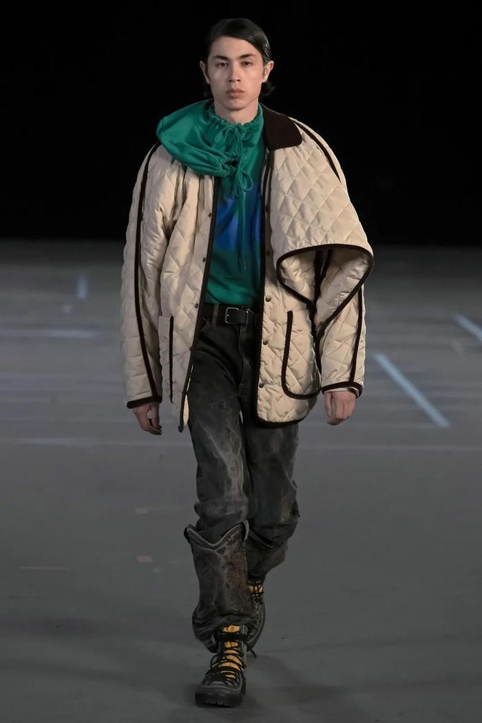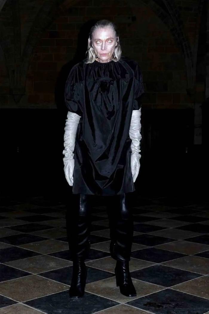Rick Owens从他最喜欢的乐队之一The Ramones汲取灵感,此外在本季,他正式与Converse合作,推出了合作款TURBODRK Chuck 70——他将该款鞋的鞋头盖变异成了更具Rick Owens风格的比例,并在该品牌All Star通常会出现的地方又增添了一枚五角星。最亮眼的单品还包括一双野性十足的雪人式高筒靴——落在浓郁的森林绿和咄咄逼人的黑色之间,这款鞋将穿着它们的模特变成了神话般的人神混血。