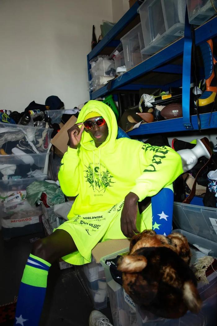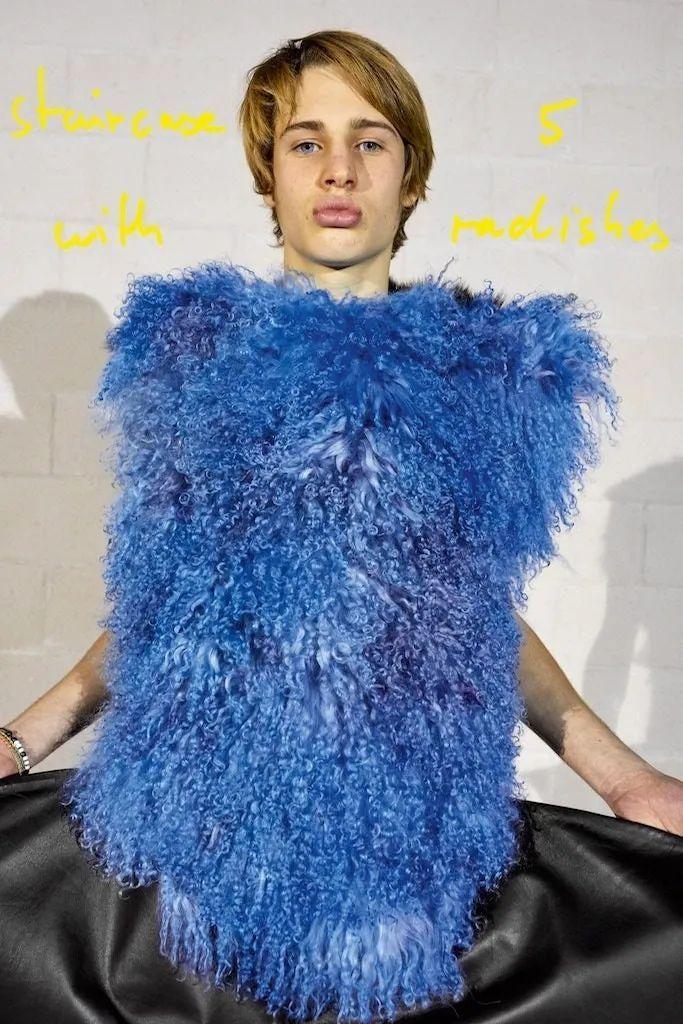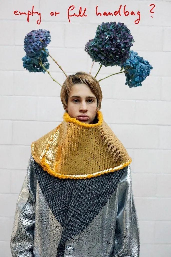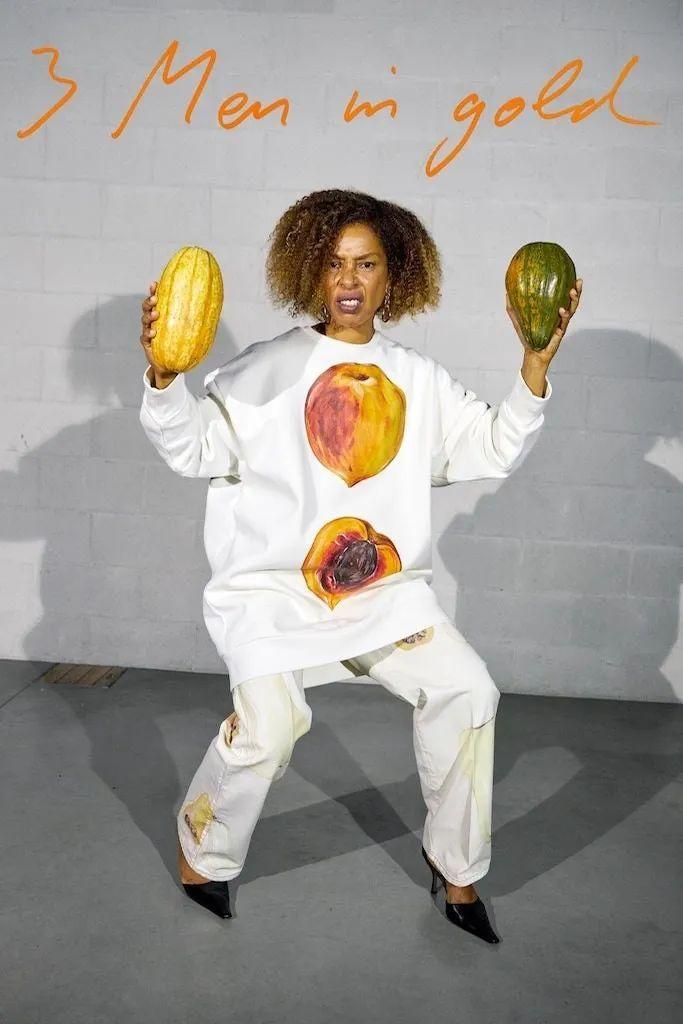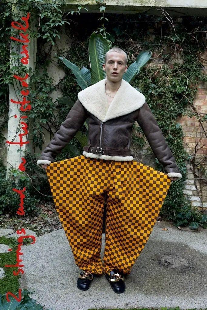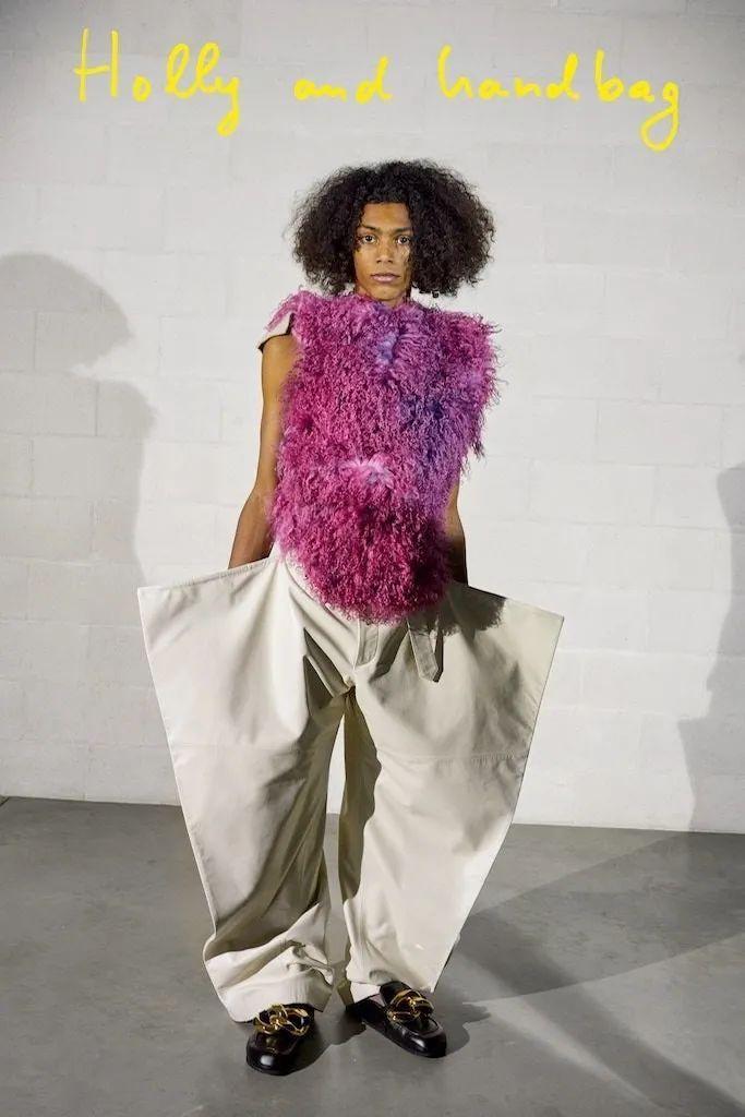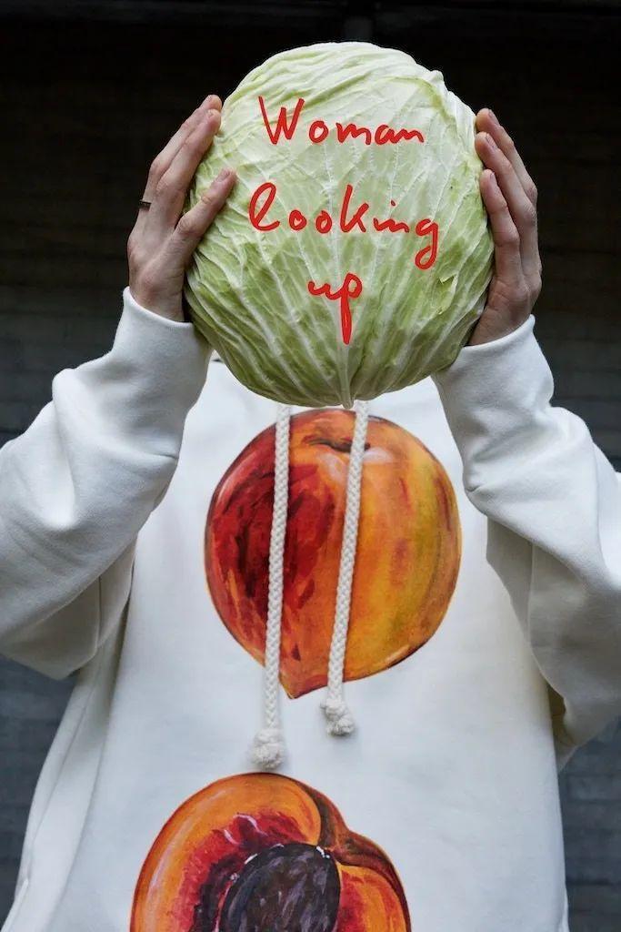 新系列拍摄在伦敦,Okonedo是唯一女主角,她与其他几位男模一块穿上了卡通式的宽大长裤、戏剧效果俱佳的毛茸长袍与糖果色外衣,还包括几件慵懒的定制西装。点缀其中的是各式各样的水果和蔬菜,奥科内多挥舞着一对南瓜,另一个则是极具美感的罗马菜花。丰收节的主题延续到服装本身,马海毛毛衣上绣着鲜艳的粉色萝卜,大号运动衫的胸前是切开的多汁半边桃子。总而言之,非常天马行空,让你忍不住也饿了起来。