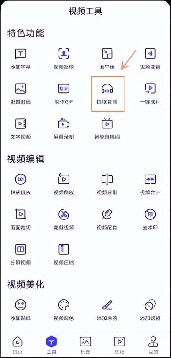 步骤一:打开手机软件操作界面,从【工具】一栏中找到【特色功能】里的【提取音频】,点击选择【提取音频】。