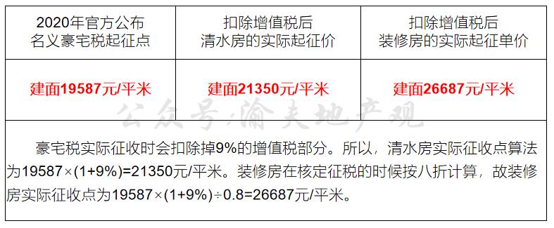 2020年重庆豪宅税起征点在扣除增值税部分后,实际起征点应为21350元/平米。