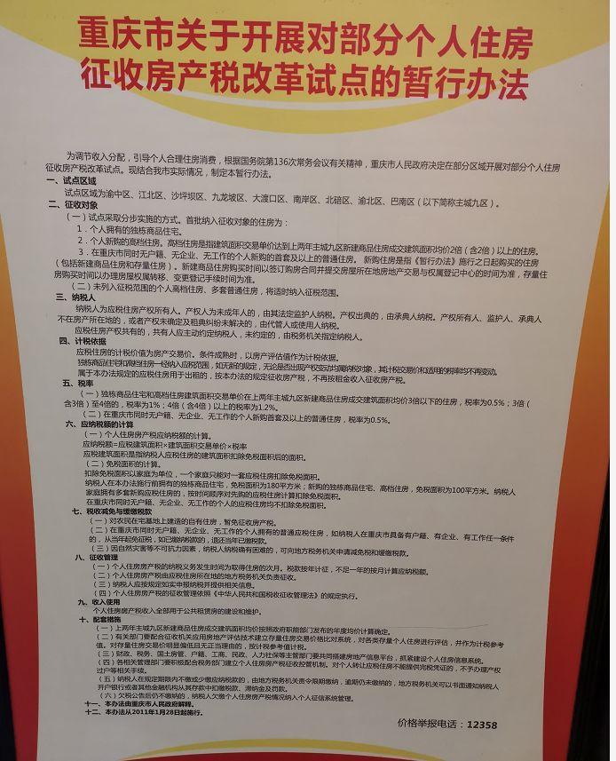下图是重庆2011年出台房产税的的公开文件的内容,此文件实际上在各大售房部均有公示。