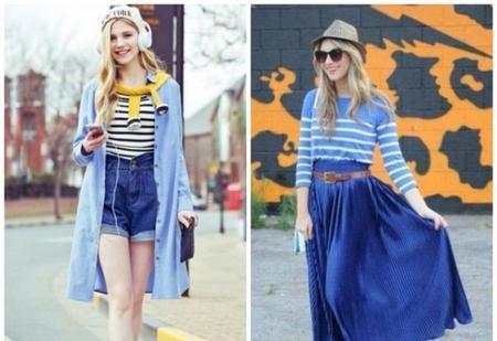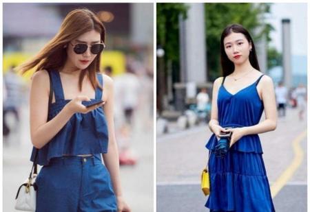 蓝色有非常强的包容性,是百搭色;深蓝色半身裙配上衣,这要考虑到自己的身高和肤色。