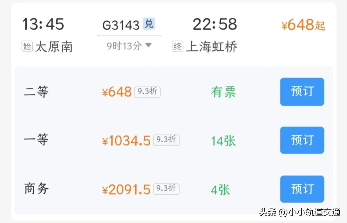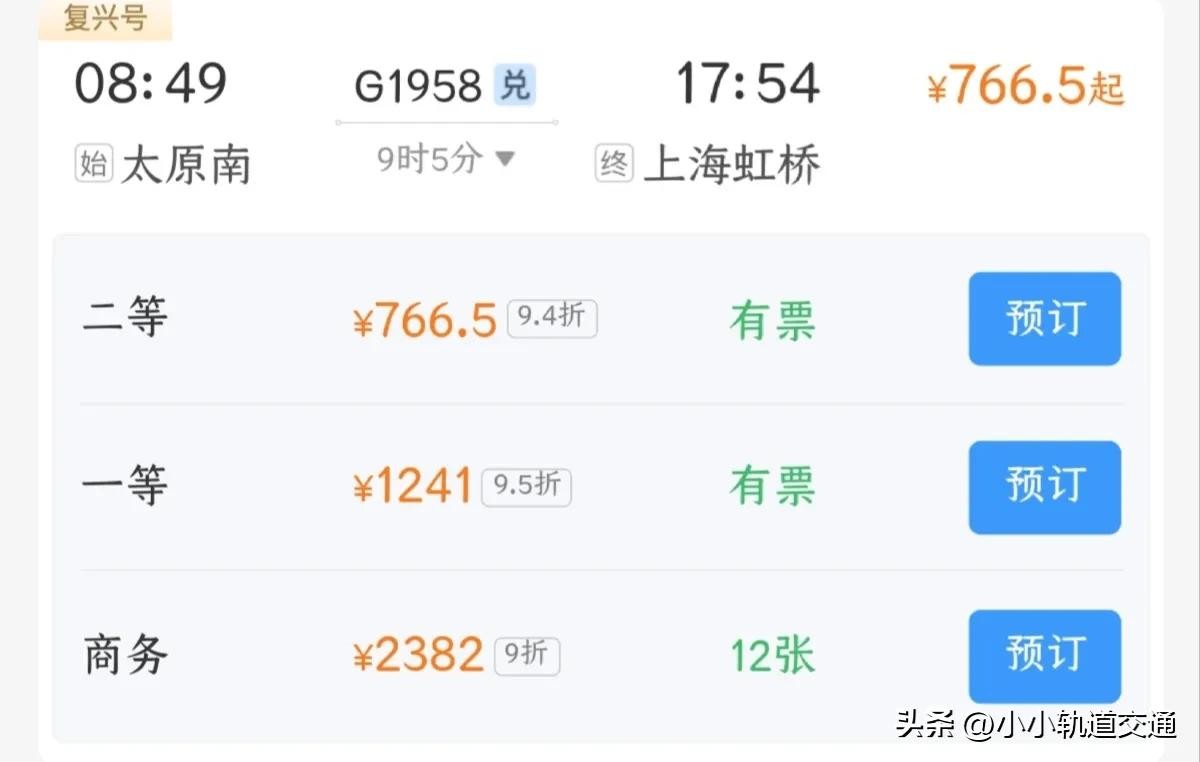 G1958次列车全程耗时9小时5分钟,打完折后二等座766.5元。其实这条线上还有另一趟车次更快,G1954次列车只需8小时48分分钟,票价755.5元,但是G1954并不是太原始发的车次,只是运城到嘉兴的过路车。