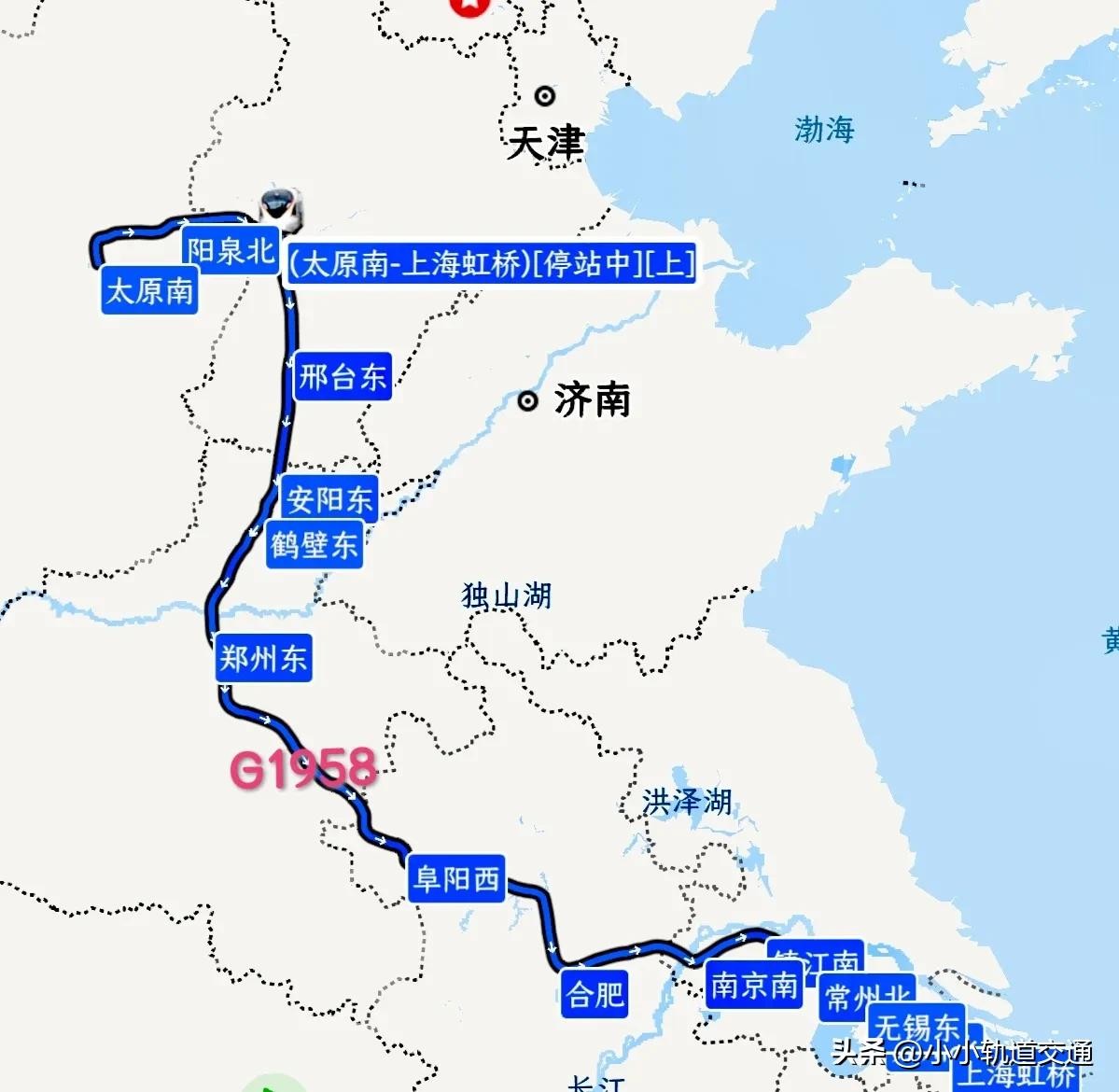另一条线路是G1958次列车,这趟车早上8点49分从太原南站始发,经阳泉北后到达河北石家庄,然后在京广高铁线上运行到河南郑州,然后经阜阳后到达安徽合肥,沿着沪蓉铁路向上海方向前进,最终于下午17点54到达终点站上海虹桥站。
