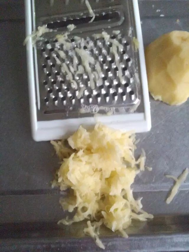 2、用刨丝器最小的孔擦成细丝。【刨好的土豆丝不要泡水啊!不要!】