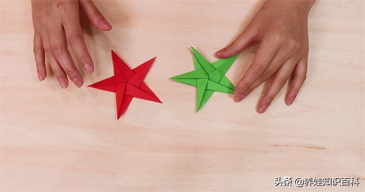 学会了吗?学会之后可以跟孩子一起多折一些,颜色也可以多样一些。把折好的五角星可以贴在墙上,做一副挂画,也是很好看的哦。