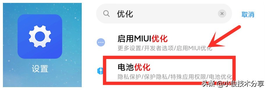 打开设置,然后直接输入【优化】,选择【电池优化】