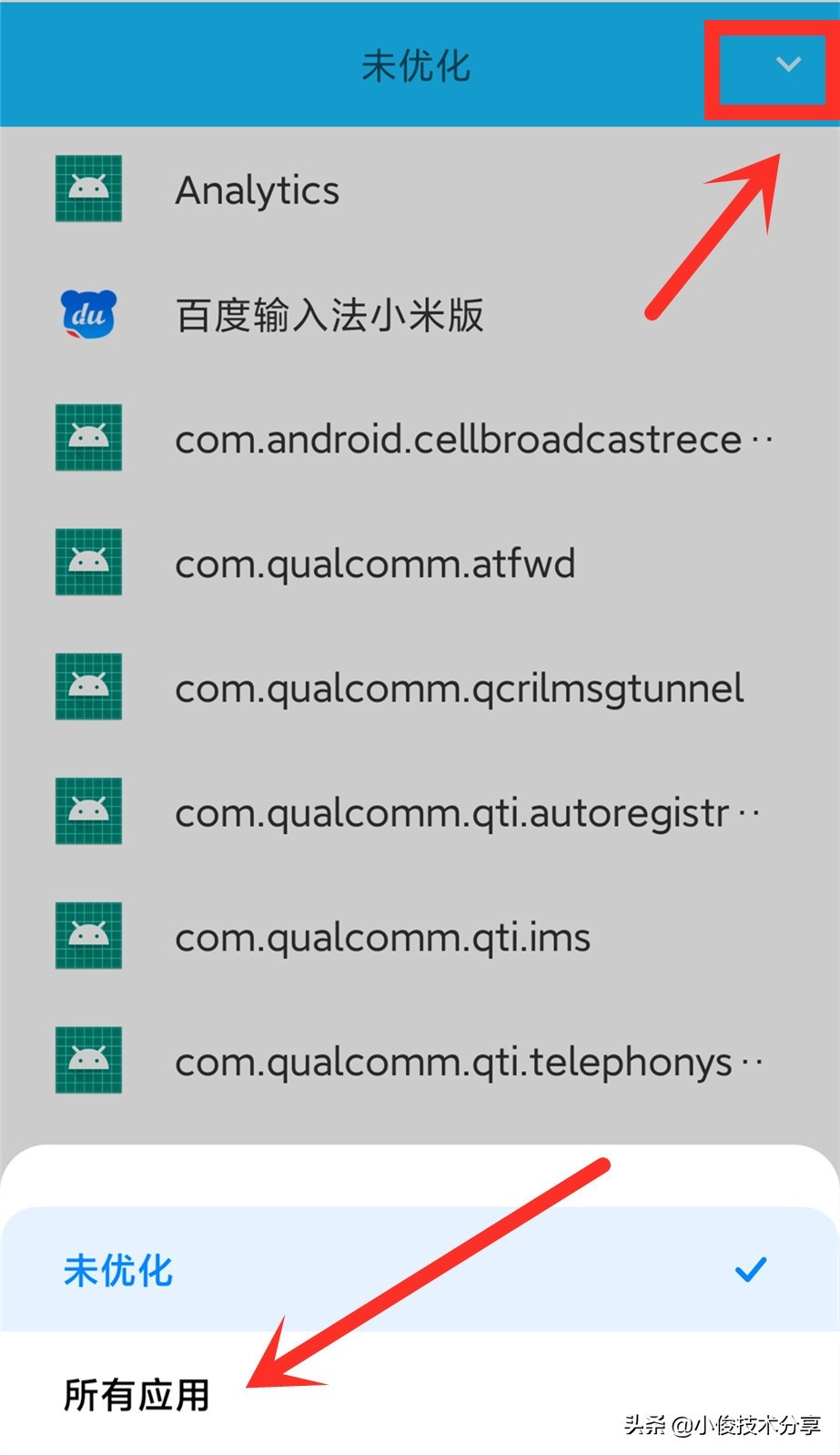 在【电池优化】中,点击小箭头选择【所有应用】!