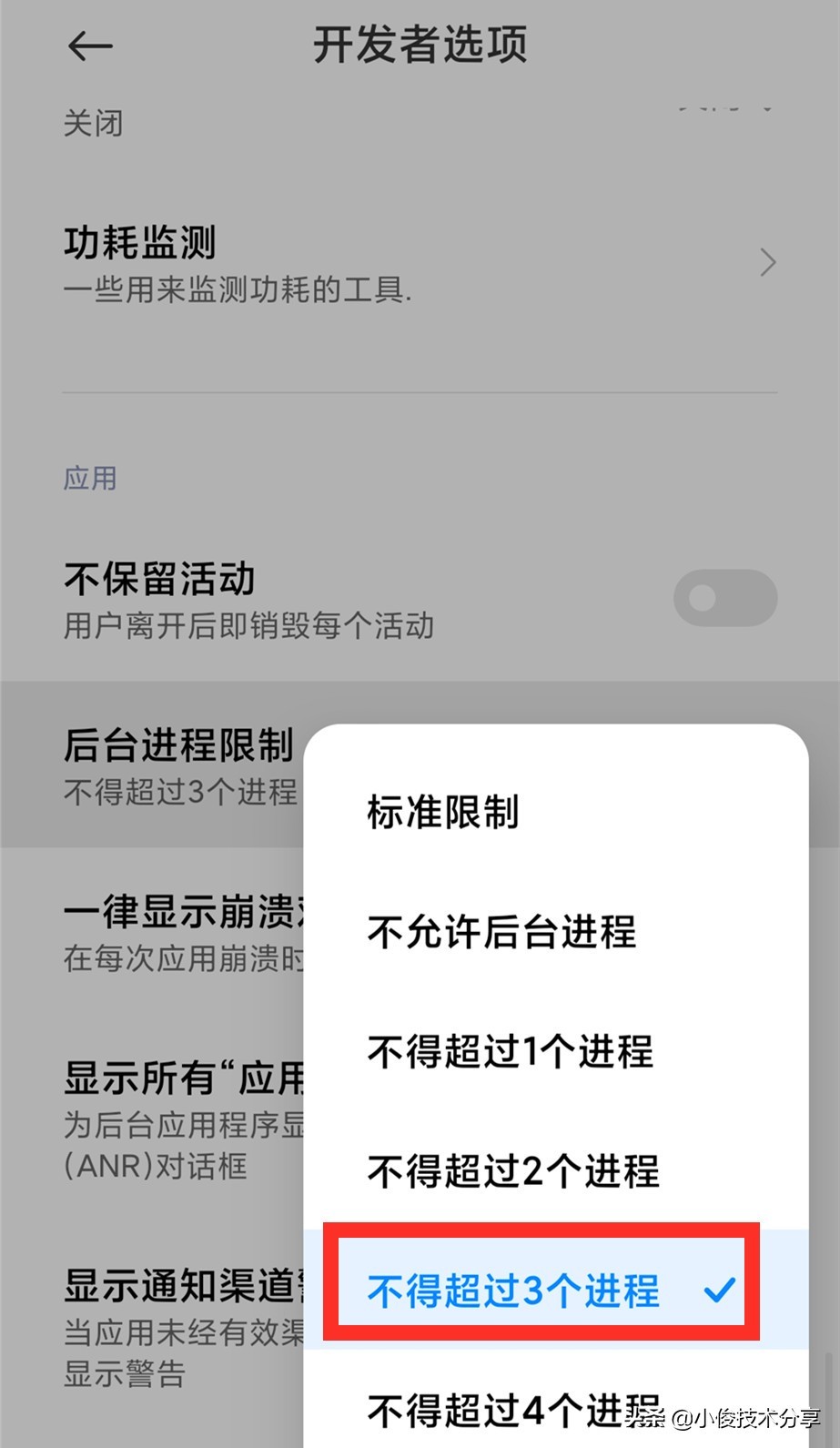 此步设置需要提前开启开发者模式,打开开发者模式之后往下找到【进程限制】,把进程限制设置为【不得超过3个】!