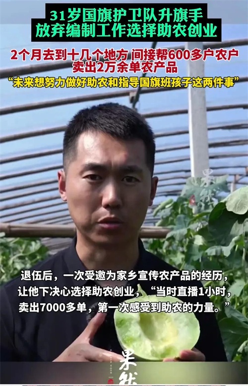 他选择助农创业也是在一次偶然的经历,因为一次为家乡宣传农产品,一个小时卖出7000多单,让他感受农产品的需求和助农的力量。