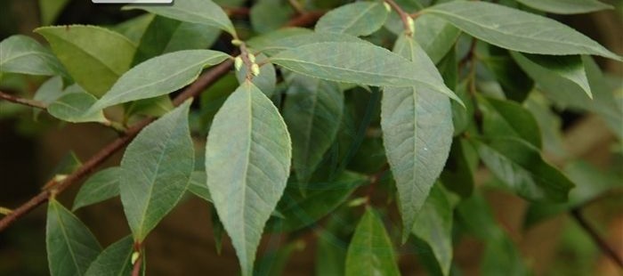 二是单叶互生,叶片薄革质,椭圆形、菱状椭圆形、披针状椭圆形或披针形,长4-9公分,叶边有细锯齿,表面有光泽,两面无毛。