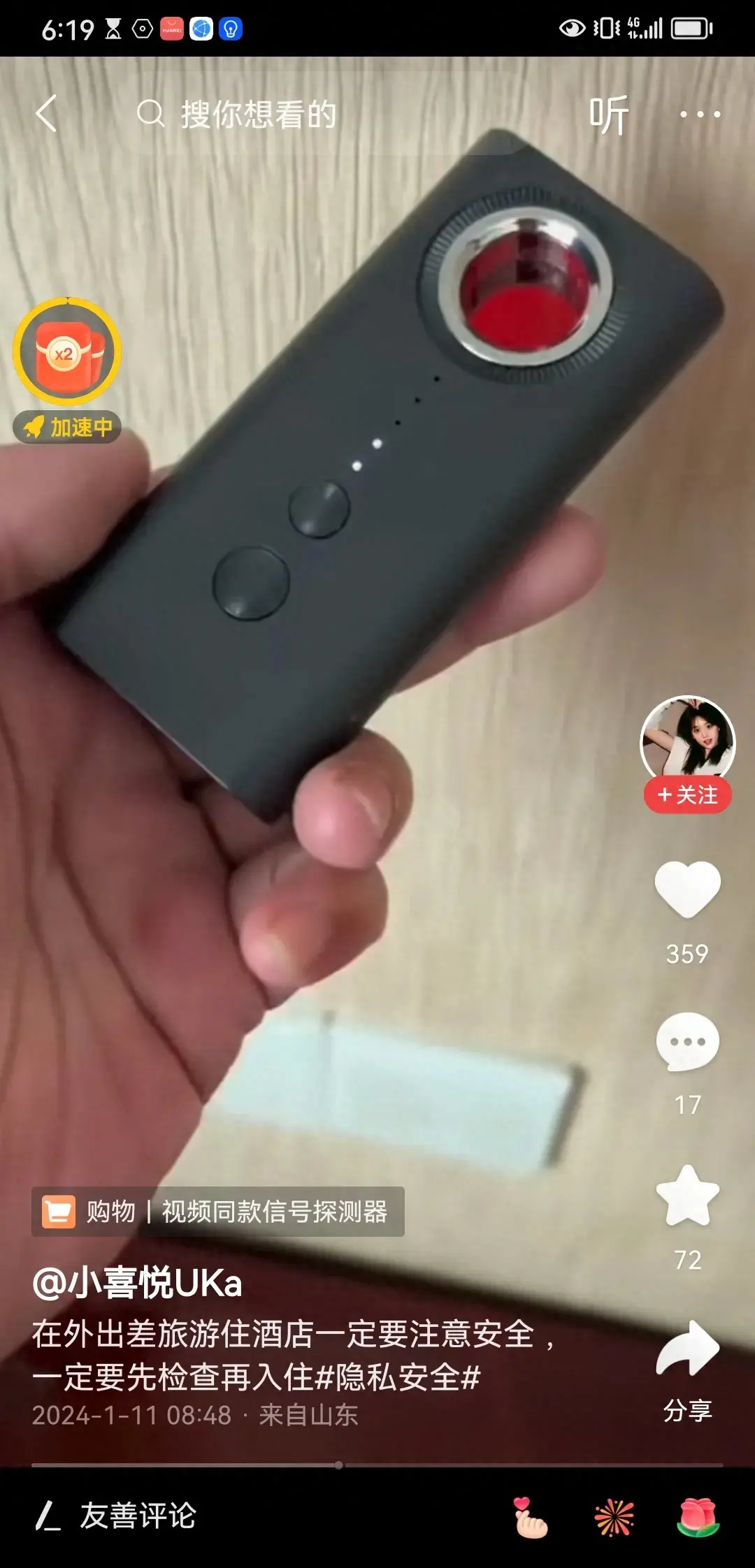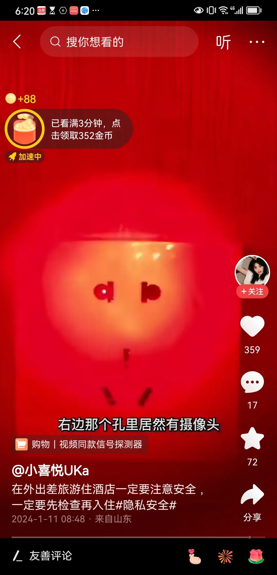 网友拿着一个测试摄像头的工具,发现了隐藏在插座内的一个非法摄像头。