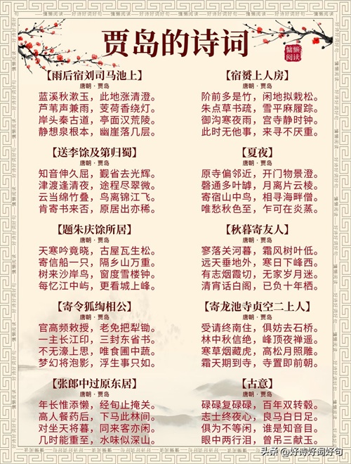 唐代诗人贾岛诗词每首都惊艳千年,值得收藏起来,值得一读;您还知道贾岛哪些诗词,一起分享,一起学习……