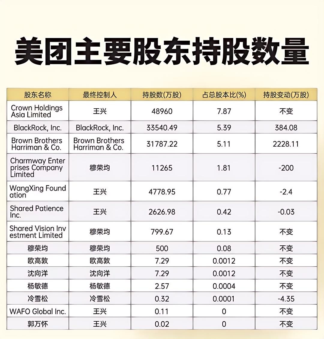 美团其余的76.89%股份为公众持股,单一股东持股比例未达到2%的公开披露要求。