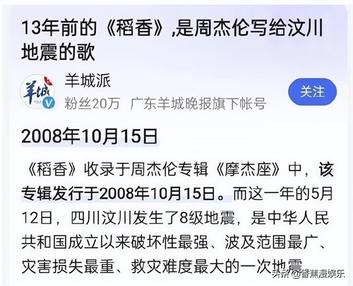 5月12日零点刚过,就有大批艺人纷纷发文,以此来悼念逝去的同胞。随着关键词指数的攀升,《稻香》这首歌逐渐被许多网友翻了出来,原来这首回忆童年的歌曲一直被大众误解,而它真正的寓意则是周杰伦为5.12灾难所作的单曲。