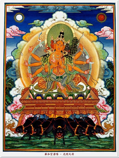 她多呈现为天女的形象,有的传说中她身如阎浮檀金色,光明如日,顶戴宝塔,着红色天衣,腕钏、耳环、宝带、璎珞等庄严其身。