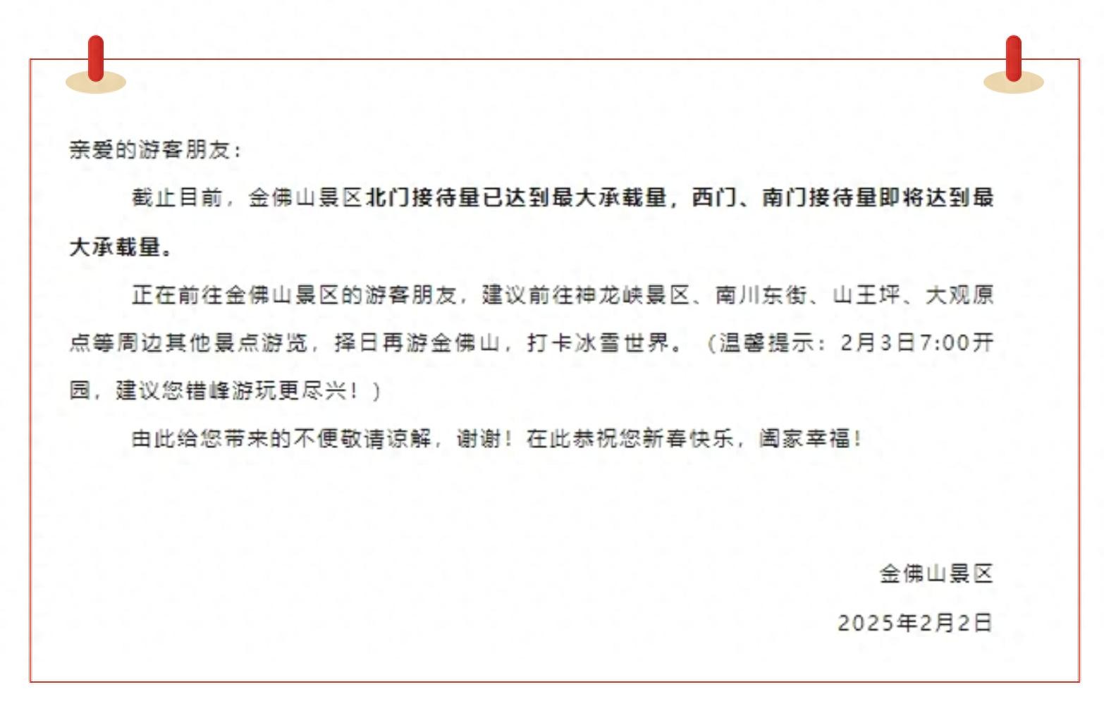 洪崖洞景区连续在2月1日和2月2日,发布游客瞬时接待量即将达到峰值的公告,截至2日17时,景区已启动黄色预警。建议正前往洪崖洞的游客,请考虑选择渝中区其他景点游玩,择日前往洪崖洞,错峰出游。