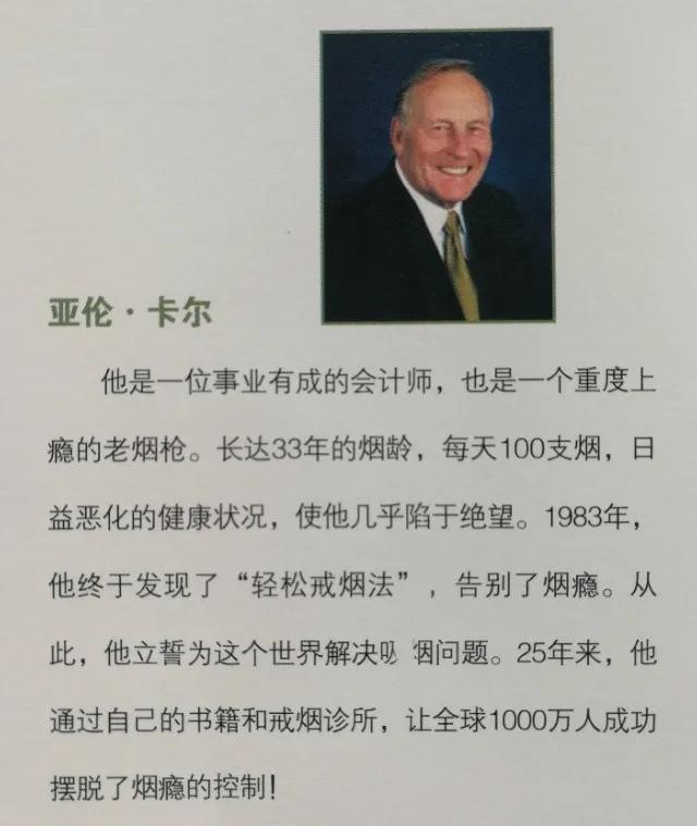 偶然间翻到时跟大家一样的质疑,我也只能说一起试试吧。书的作者是美国的亚伦.卡尔,我并不知道是谁,我不是博学多才的人,但是百度和书里告诉我,他是个地地道道的老烟枪,每天要抽100根左右的香烟,身体也是每况愈下,就这样一位老烟枪确在50岁不到的时候,成功的戒除烟瘾,并投身戒烟运动,还在全球开了70多家戒烟所,出版了这本书,书还畅销全球,是什么让这是烟鬼重塑自我,帮助其他烟鬼呢,哈哈,希望他能帮到你。