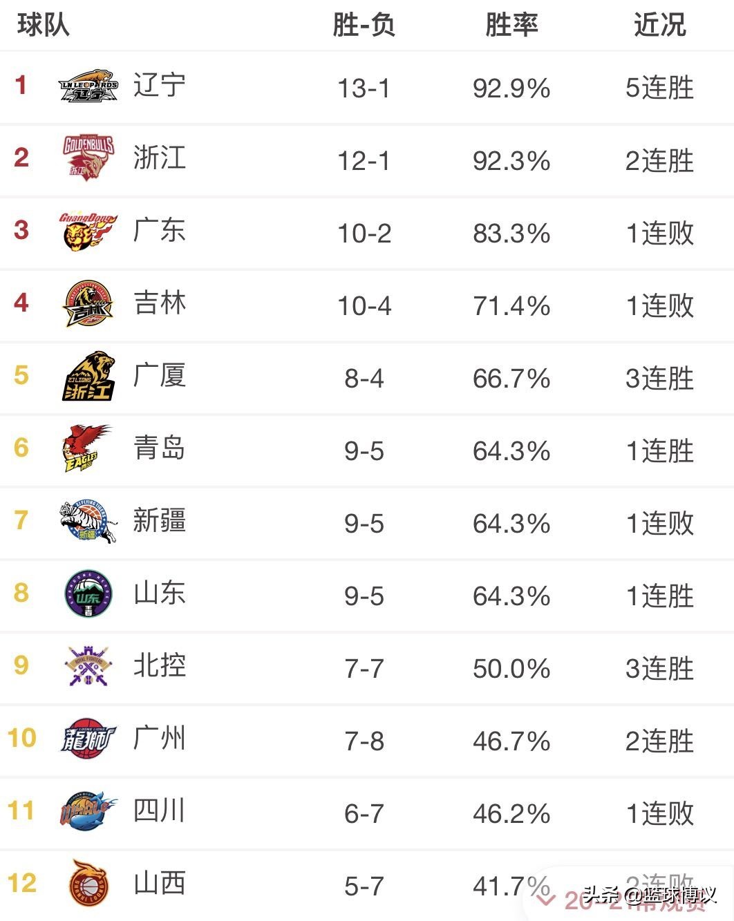 目前,12强排名再迎变化,并且各支球队的差距并不大,一场比赛足以搅乱整个积分榜排名,一切大意不得,不然就是下一个北京队(目前夺冠热门北京队以5胜7负排名第13,太打脸了)。