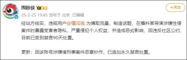 此前2月25日,爆料账号@懂瓜呱 忽然爆出“惊天猛料”,称某知名导演涉嫌侵犯某知名女演员,因爆料内容尺度大,表述方式肆无忌惮,引发网友众怒。