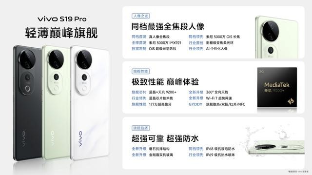 在性能配置上,vivo S19 Pro也毫不逊色。它搭载了天玑9200+旗舰芯片,经过vivo蓝晶技术栈的优化,跑分高达177万以上。同时,配备的4500nits 120Hz护眼屏、同档最薄的IP68&IP69双重防水功能以及超快超稳的Wi-Fi 7等技术,都确保了用户在享受轻薄机身的同时,也能获得旗舰级的全面体验。