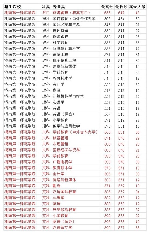 湖南第一师范学院2020省内各专业录取分数线 各省最低投档线