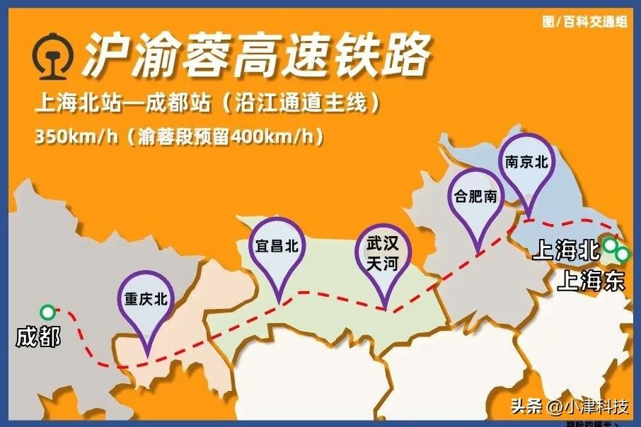 第六种线路,尚未建成通车的沪渝蓉高铁,全程约2100公里,建设标准350km/h。