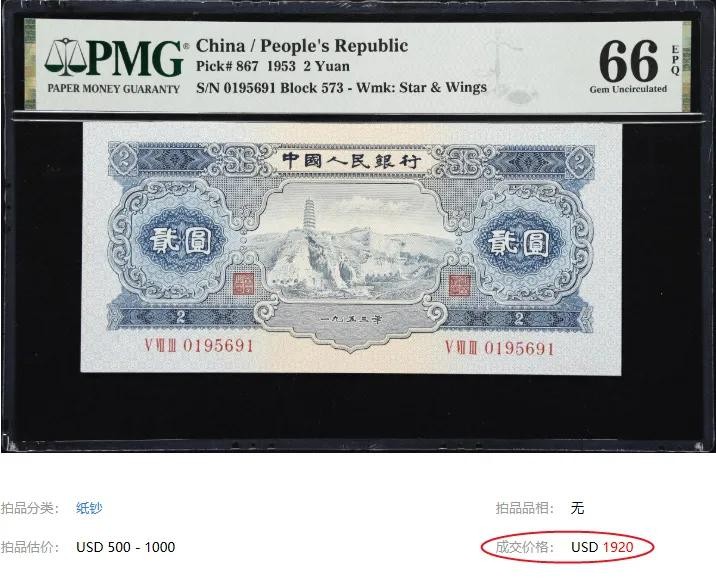 在今年的SBP2024年10月香港拍卖会中有一张PMG66分的评级币,号码无3.4.7经过多轮竞拍,最终以1920美元落槌!折合人民币差不多13900元。
