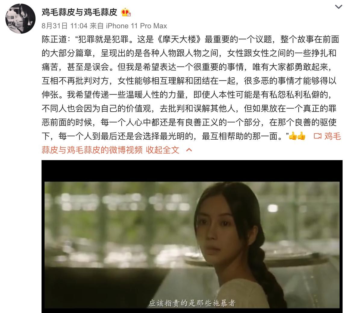 徐静蕾作为圈内有名的才女,除了在私生活上十分特立独行之外,对于很多事情都有自己独特的思考。近日《摩天大楼》正在热播,8月31日,徐静蕾就在网上分享了一段该剧导演陈正道的想法,表示自己十分赞同里面女性能够团结在一起的观点。