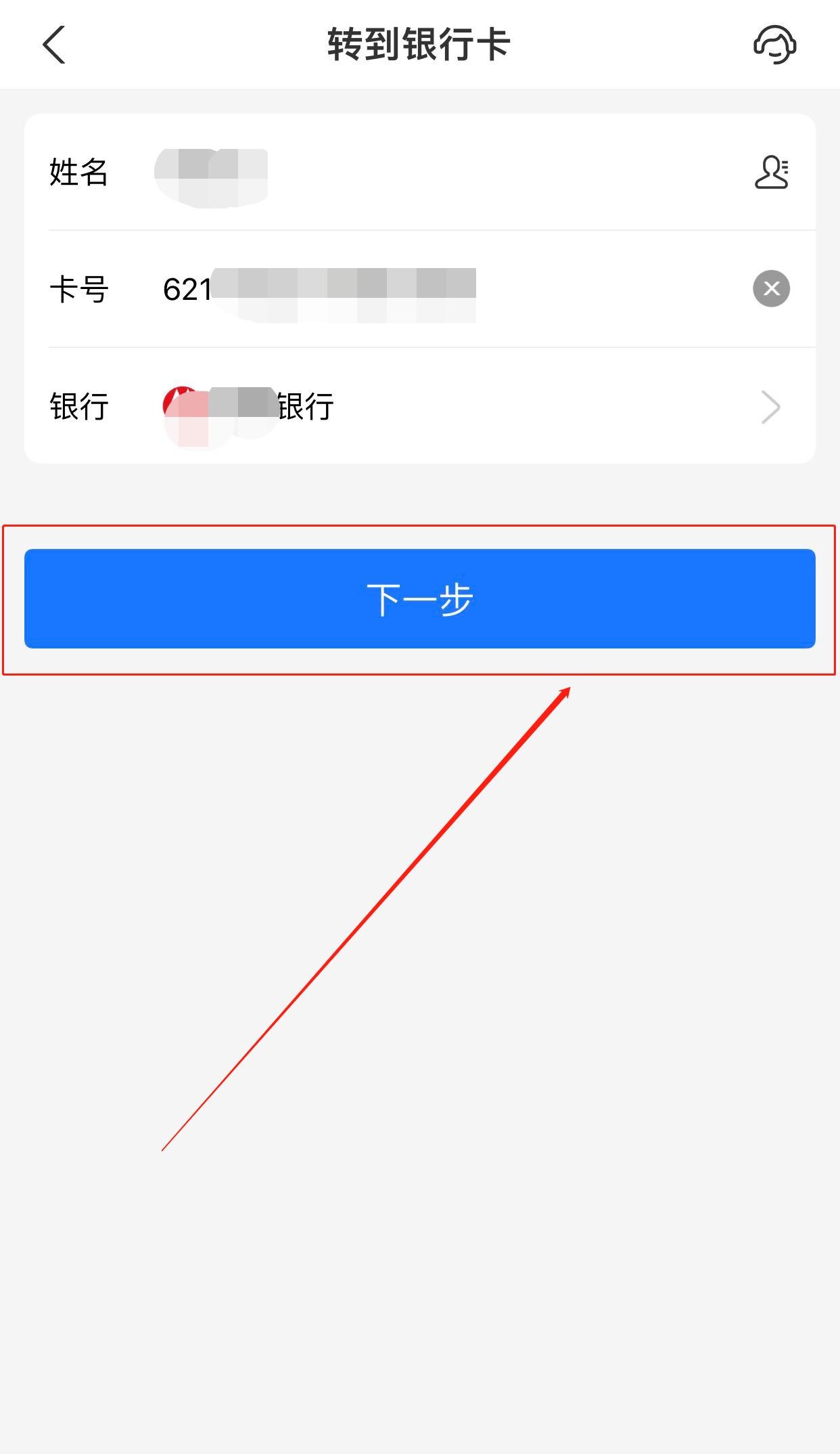 输入要转入的银行卡姓名、卡号、开卡行,点击“下一步”。