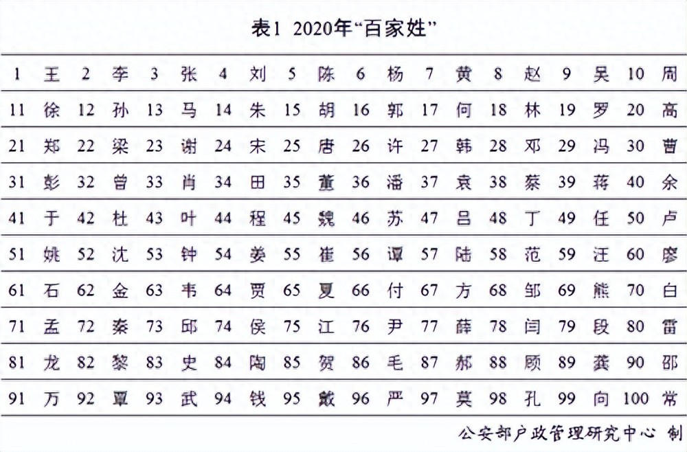 我国姓氏人口排名