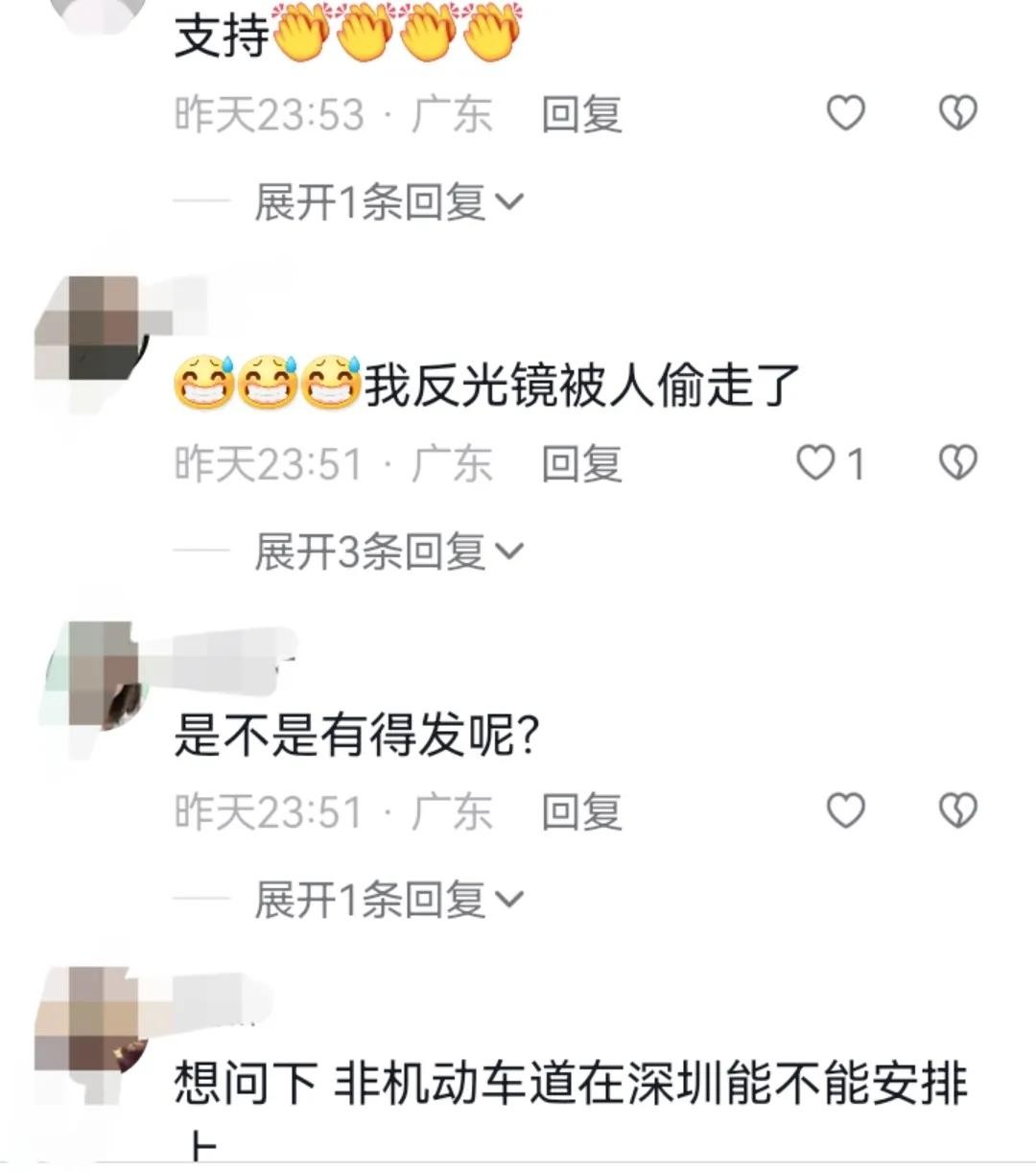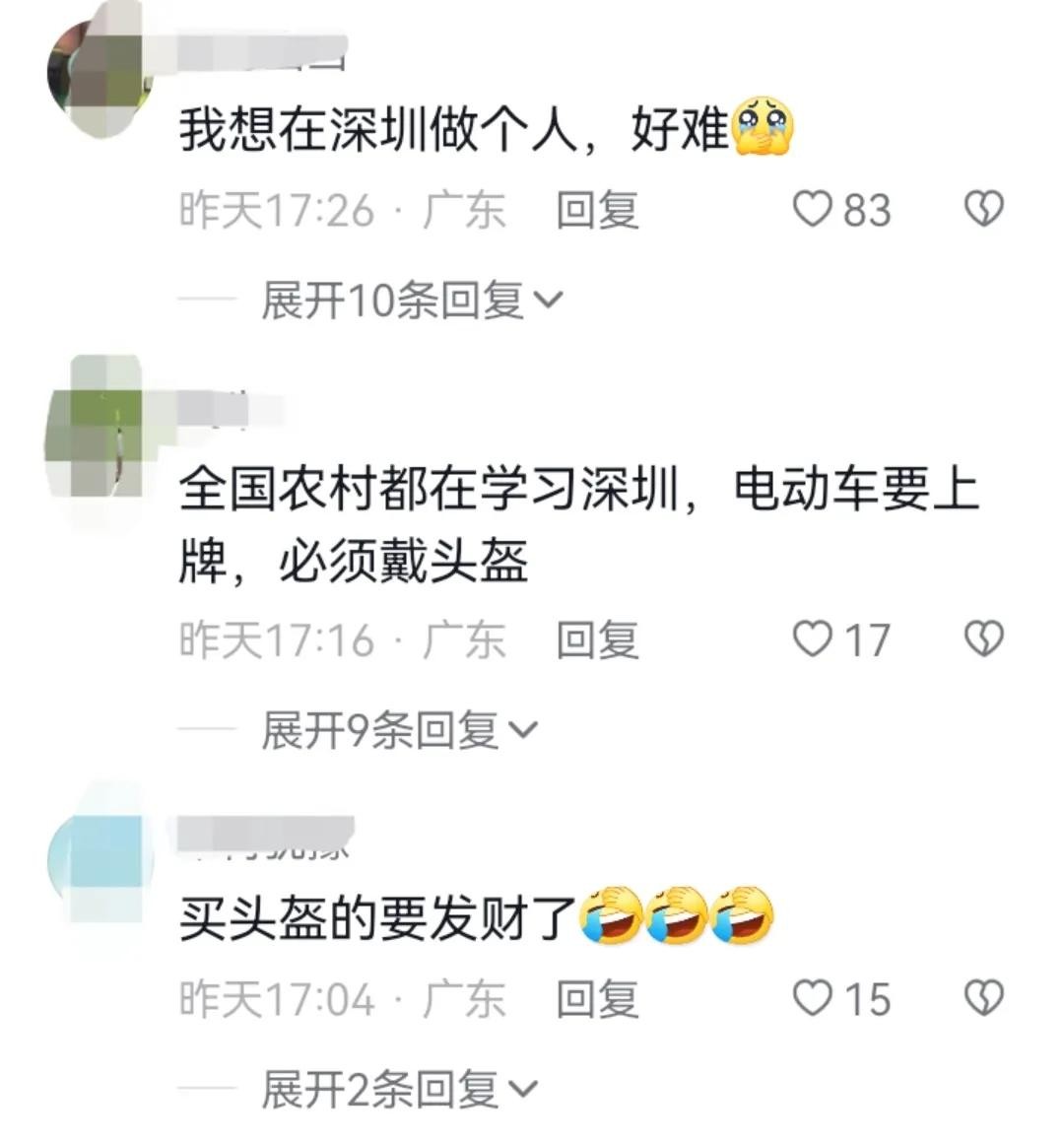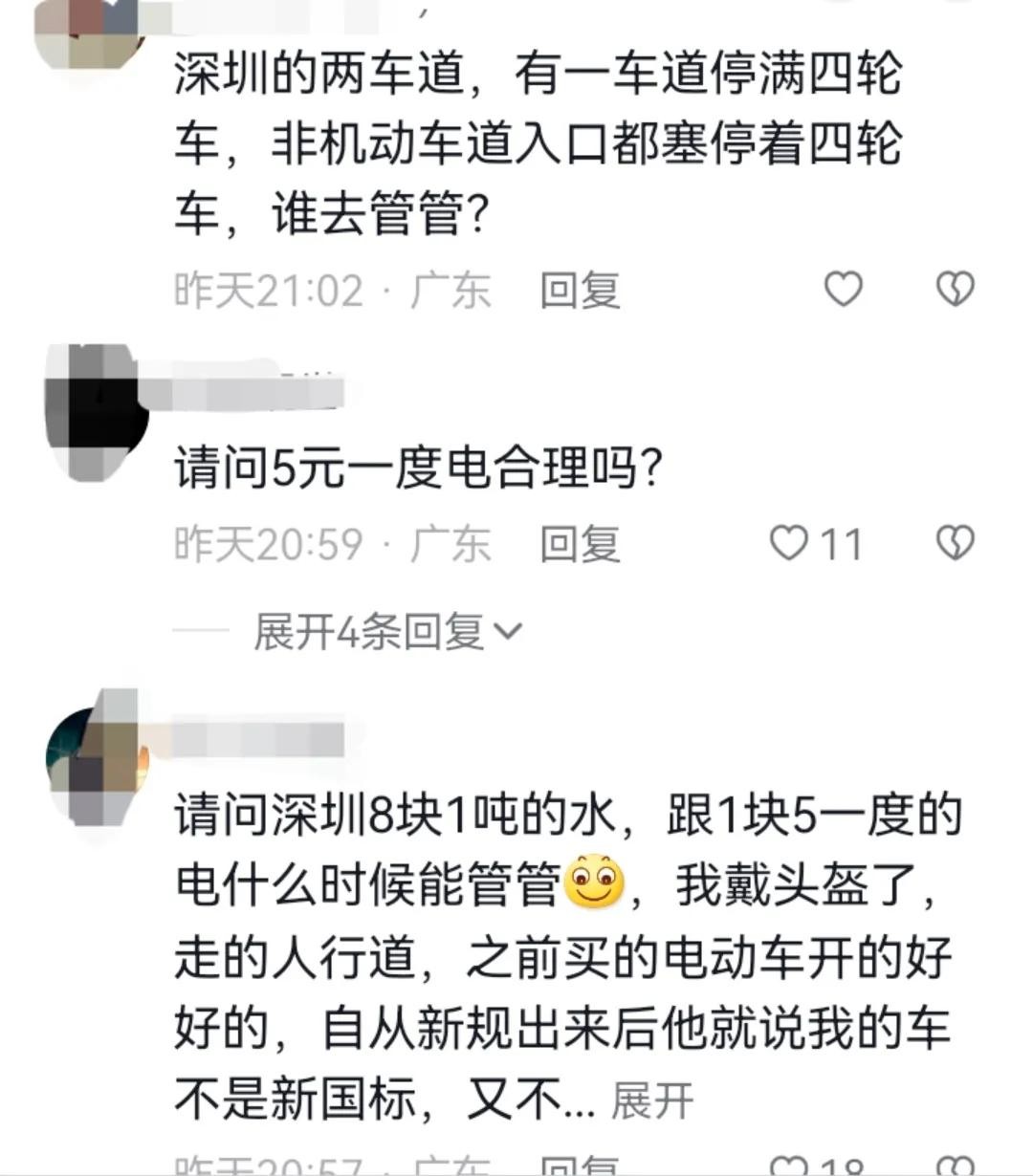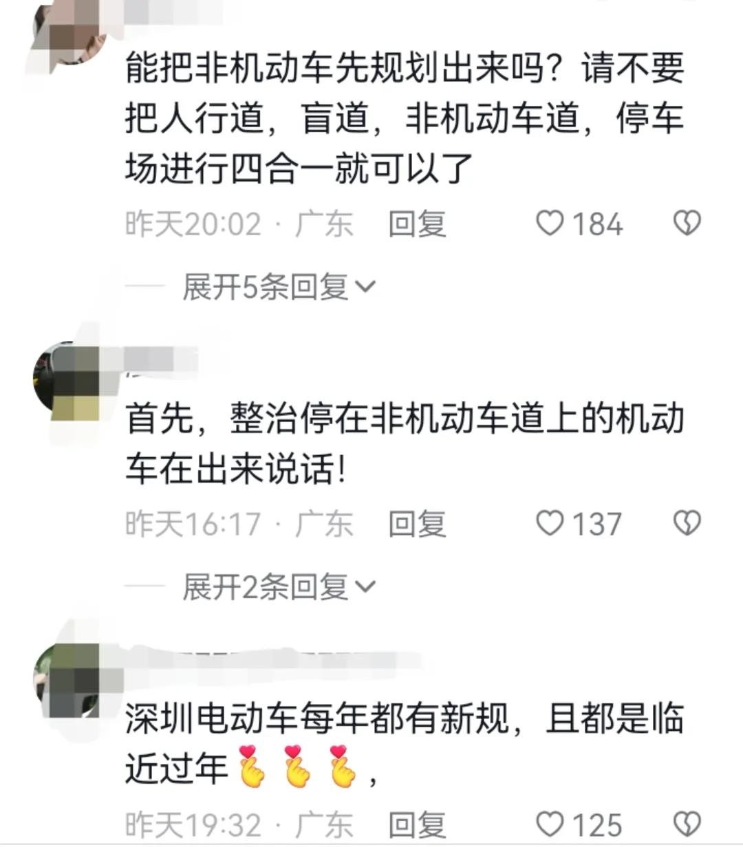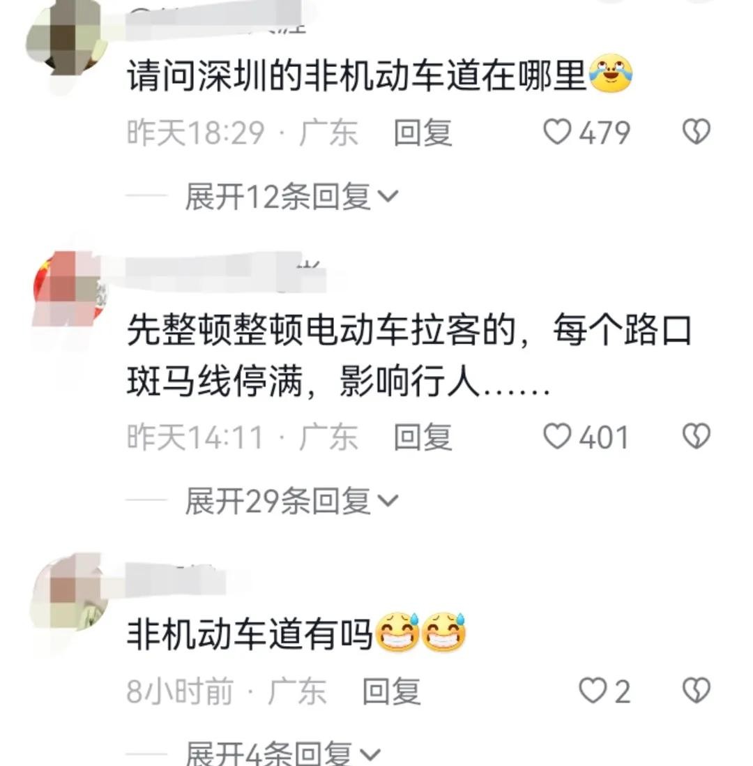 对此,网友们纷纷吐槽在深圳太难了。最近深圳加大力度严查电动车违规,网友们纷纷反映深圳非机动车道很少,希望严查的同时,规划出非机动车道供电动车行驶。还有网友表示,先整顿地铁,车站拉客的以及机动车乱停乱放行为,这两者经常把路口都堵了。