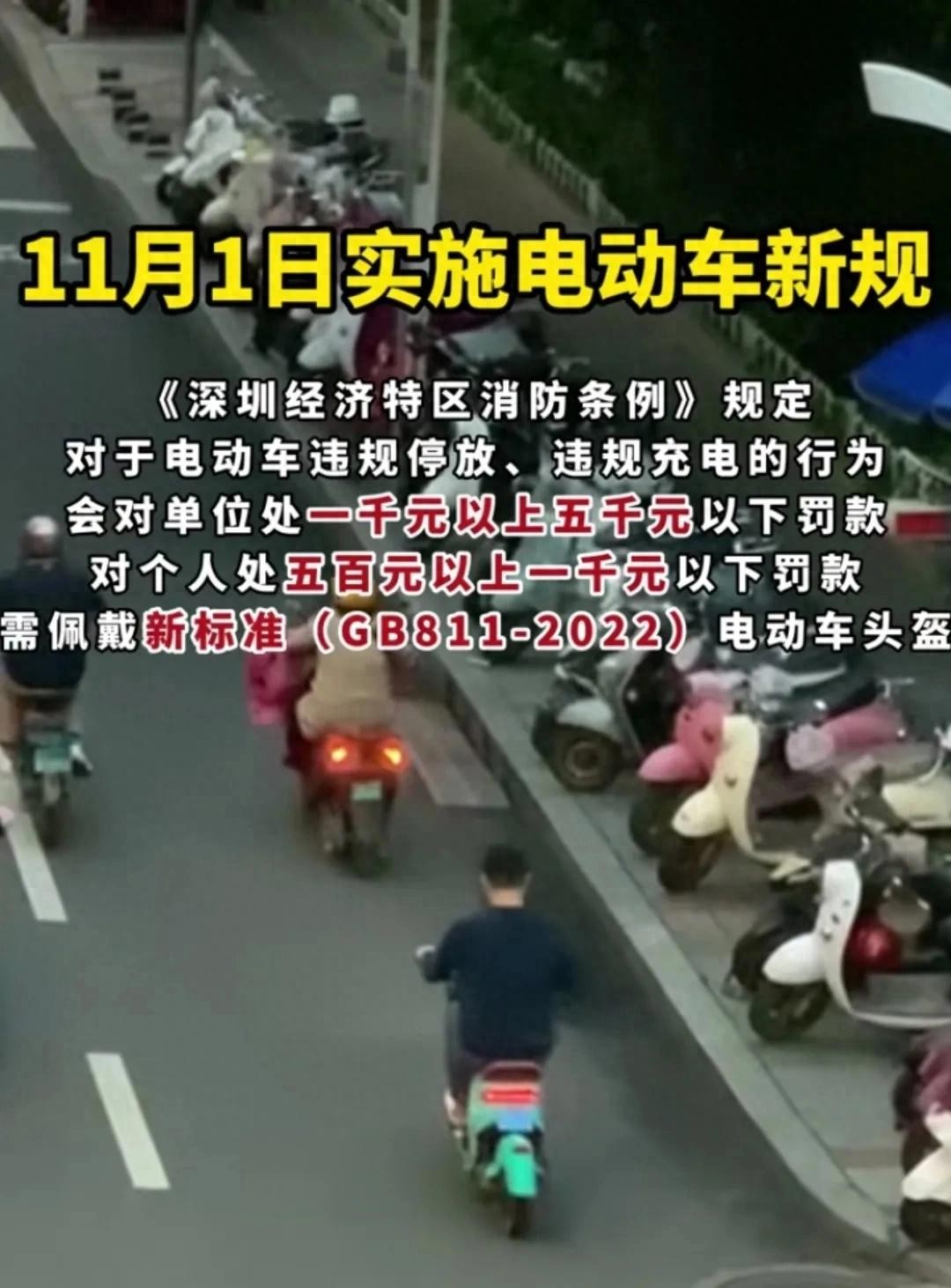 《深圳经济特区消防条例》规定电动车需佩戴新标准(GB811-2022)电动车头盔,违规停放、充电的行为会对单位处一千元以上五千元以下罚款,对个人处五百元以上一千元以下罚款。