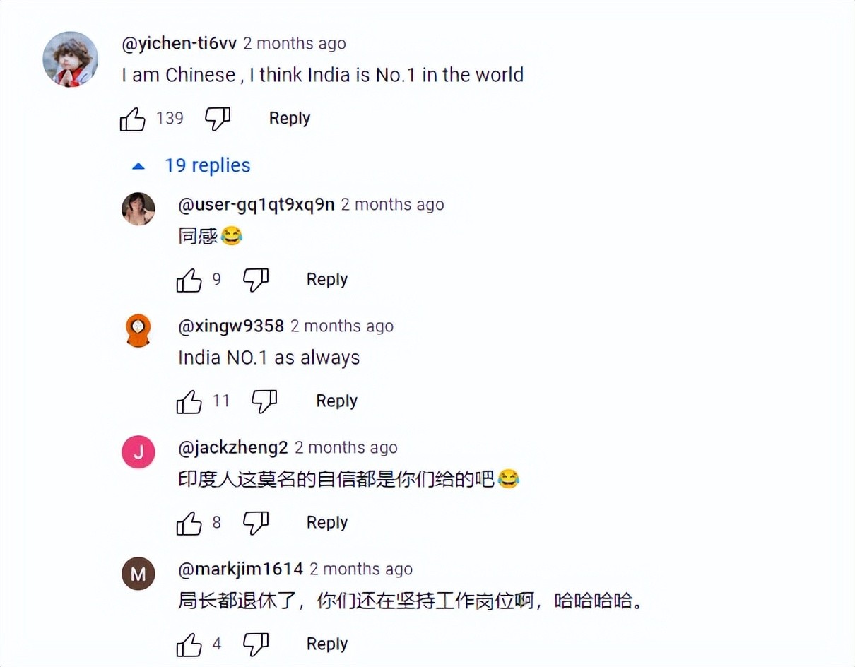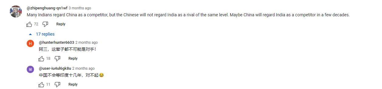当然也有中国网友看好印度未来的发展前景。他说:许多印度人将中国视为竞争对手,但中国人不会将印度视为同等水平的竞争对手。也许中国会在几十年后将印度视为竞争对手。但立刻有网友回复道:阿三,这辈子都不可能是对手!中国不会等印度十几年。