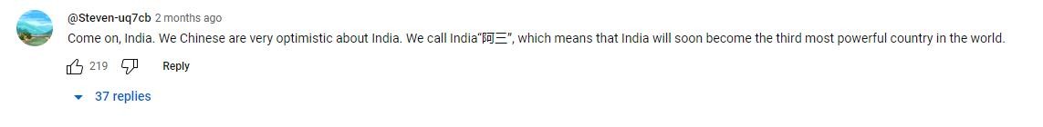 加油,印度。我们中国人对印度非常乐观。我们称印度为“阿三”,这意味着印度将很快成为世界上第三强大的国家。