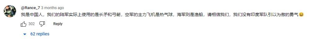 我是中国人,我们的陆军实际上使用的是长矛和弓箭,空军的主力飞机是热气球,海军则是渔船,请相信我们,我们没有印度军队引以为傲的勇气