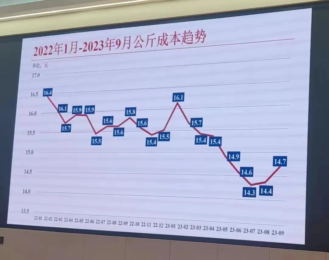 据了解,2023年1月至9月,牧原股份的生猪养殖平均成本为15.0元/kg,其中一季度平均成本为15.7元/kg,二季度为15.0元/kg,三季度为14.5元/kg,呈逐步下降趋势。