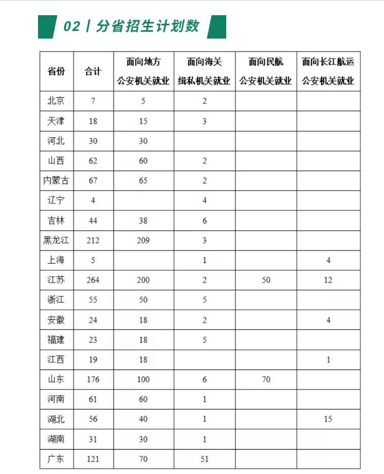 我们来看看南京森林警察学院今年的招生计划,南京森林警察学院面对全国总招生人数1700人,面对地方公安机关就业招生1410人,面向海关缉私就业招生120人, 面向民航公安机关就业招生120人,面向长江航运公安就业招生90人,其中面对广东招生总人数是121人,其中面向地方公安机关就业有70人,面向海关缉私机关就业的有51人。