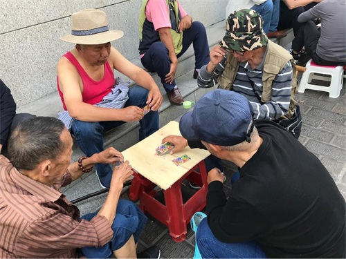街道两旁有下象棋的、有打三光金的、有打三打一的、有打二百四的、有遛鸟的,唯独一直没有发现有唱阳戏练嗓子的,不知道地地道道的原住民以前是否有见过。总之这条街道上的活动很多,大家都喜欢在这里聚集,随之带来的社会问题就来了,吃东西想便宜去南门口,买东西想便宜也可以去南门口,想找老物件更应该去南门口,还有一些他们现在讲的一些段子故事也都是从南门口传下来的。