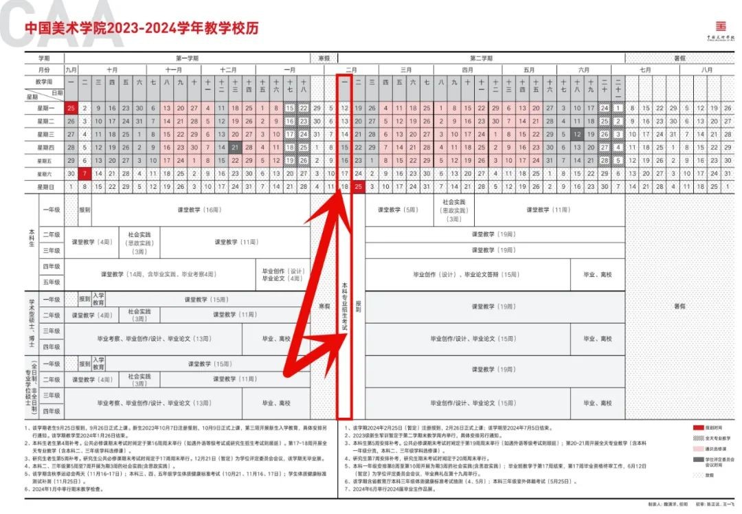 据中国美术学院学工在线网发布的《中国美术学院2023-2024学年教学校历》标注2024年2月12日-18日这一周为“本科专业招生考试”,根据往年中国美术学院的考试时间安排,这个时间应该是现场复试时间,但时间不会持续一周,应该是2月15日-16日这两天。