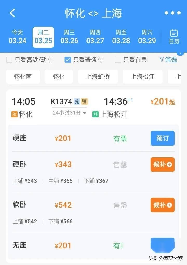 在从怀化前往上海松江的行程中,列车票价情况为:硬座的价格是201元,硬卧的价格为343元,软卧则需要542元。