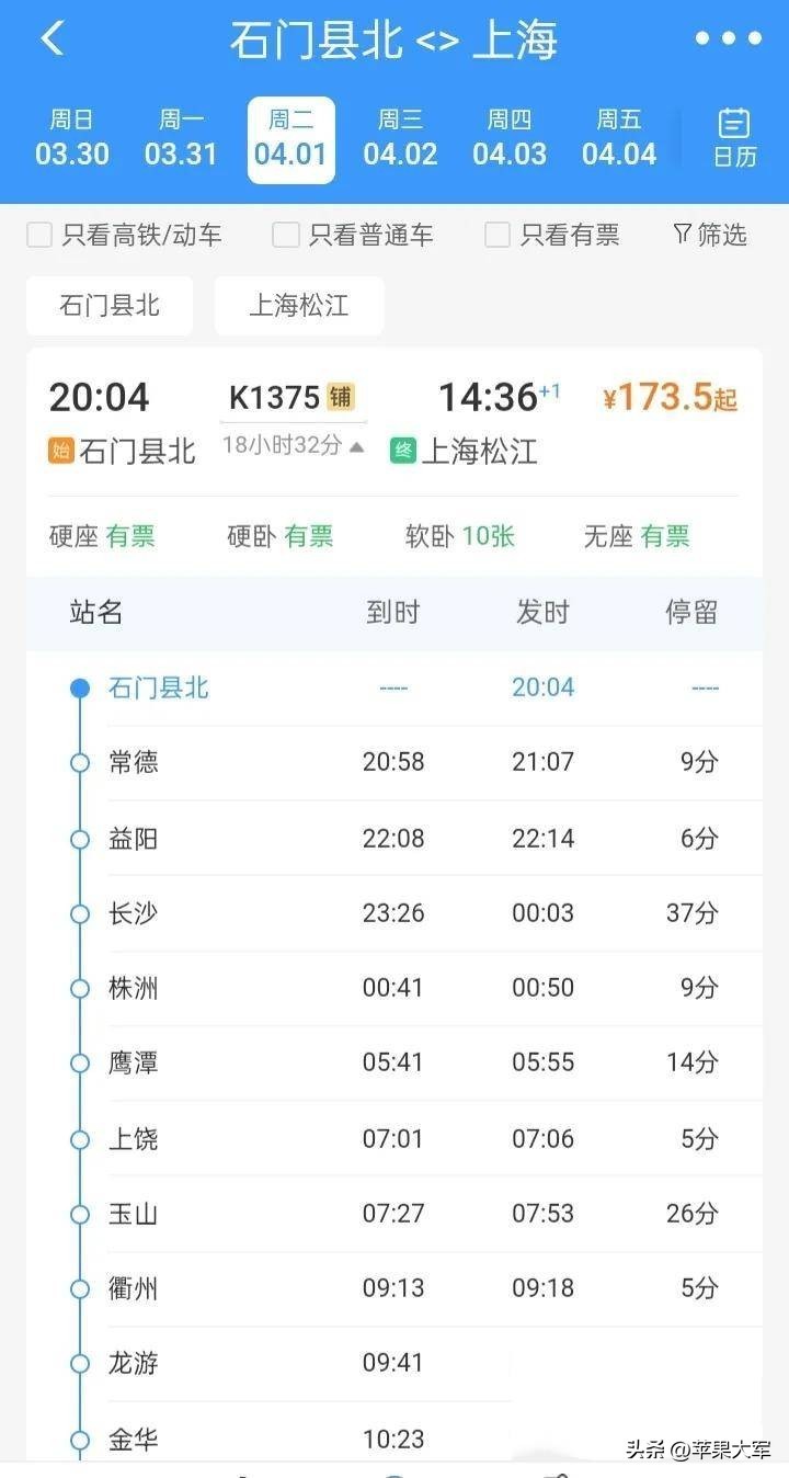 注意啦!4月1日起,K1374/5怀化至上海松江列车石门县北站始发!